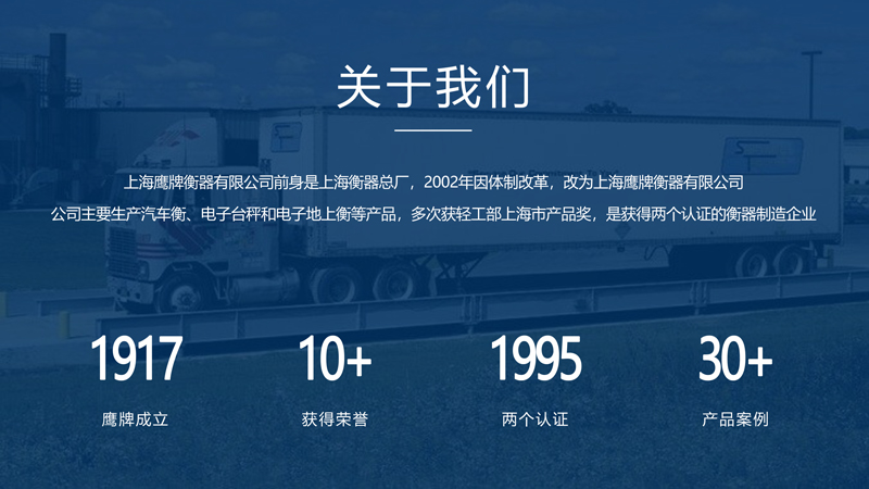上海鷹牌衡器有限公司是上海衡器總廠轉(zhuǎn)制的企業(yè),前身是上海衡器總廠,創(chuàng)建于1917年,是地磅等衡器設(shè)計(jì)、制造廠家,主營(yíng)電子地磅、電子秤以及地磅維修,2002年因體制改革,改為上海鷹牌衡器有限公司!